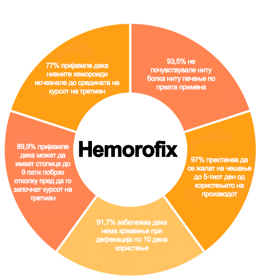До 98,7% од испитаниците јасно изјавиле дека производот ги елиминира сите симптоми во рок од 48 часа од употребата: болка, печење, чешање, крвавење или неможноста целосно да се испразнат цревата. Истиот број луѓе забележале дека хемороидите не се вратиле по прекинувањето на третманот. По 3 месеци употреба, хемороидите биле трајно елиминирани, дури и во најтешките случаи.