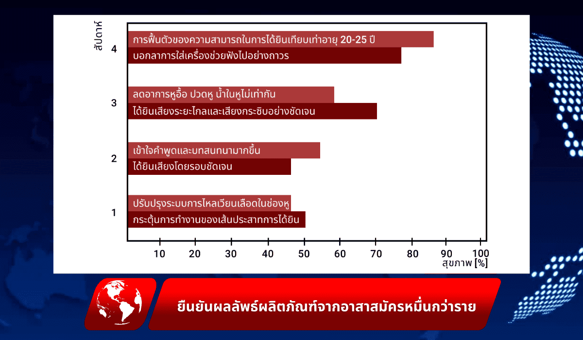 ผลลัพธ์ : เส้นประสาทการรับส่งสัญญาณเสียงได้รับการฟื้นฟู กลับมาได้ยินเสียงชัดเจนขึ้นทั้งระยะใกล้และไกล เสียงดังรบกวนในหูหายไป สามารถใช้ชีวิตได้ปกติและมีความสุขมากขึ้น