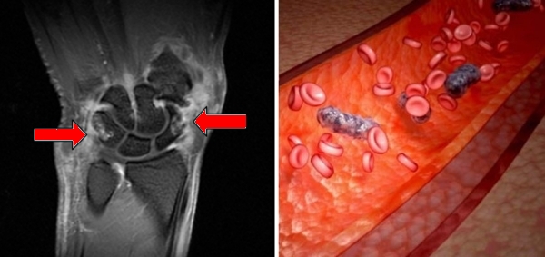 A sinistra: risonanza magnetica dell'articolazione del ginocchio. A destra: dimostrazione di depositi di particelle in un'articolazione che entrano nel flusso sanguigno.