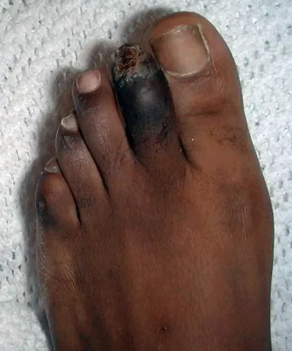 The skin is starting to rot!! First, it becomes dry, scratches appear, then eczema and boils. Muscles and bones begin to atrophy and separate from the skin. Bad smell occurs. All this leads to gangrene.