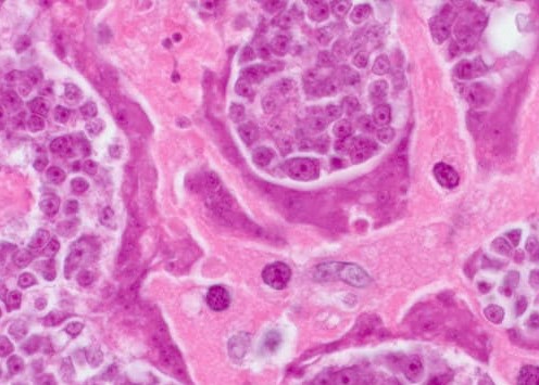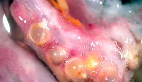 Di conseguenza, si trasformano in tumori cancerosi, infettando rapidamente gli esseri umani. La morte sopravviene nel giro di pochi mesi. Questa settimana è stato registrato un altro caso di morte d'una persona per un effetto simile. Al centro di questa foto: cellule di un tumore maligno trasmesso ad un essere umano da un verme parassita.