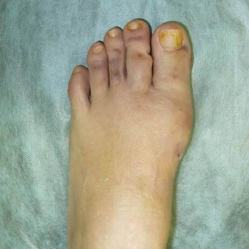 Cirugía para extirpar un hueso de una pierna. Después de una radiografía, el cirujano concluyó trágicamente que se necesitaba urgentemente una operación para eliminar el valgo. El dedo torcido ya ha dado una complicación en las articulaciones del pie, debido a esto, se lesionó parte de los ligamentos, pronto comenzará la necrosis dentro de la pierna, y luego habrá que amputar el pie.
