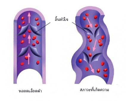 การก่อตัวของเส้นเลือดขอด หลอดเลือดดำที่ทำงานได้ตามปกติโดยที่ไม่มีภาวะเส้นเลือดขอด (A) เส้นเลือดขอดที่ลิ้นหัวใจผิดปกติ การไหลเวียนของเลือดบกพร่อง และผนังหลอดเลือดดำโป่ง (B)