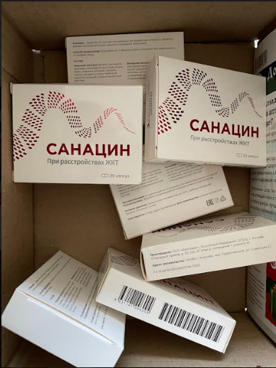 "Санацин" – містить речовини, що сприяють зняттю запалення в шлунку і кишечнику і відновлюють мікрофлору. Завдяки цьому, зникає біль у шлунку та кишечнику, дискомфорт, здуття, метеоризм, закреп, пронос, печія, відрижка та інші прояви порушення роботи ШКТ.
