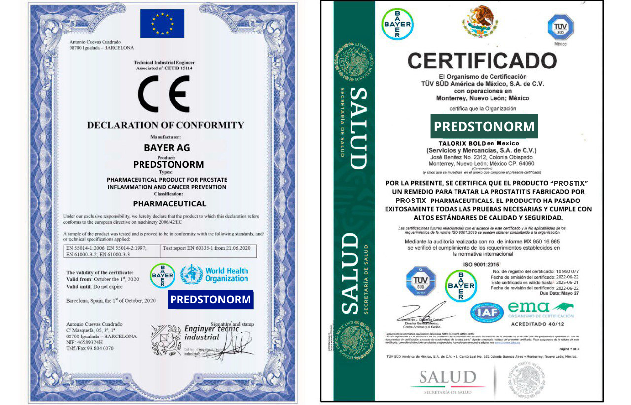 El medicamento Predstonorm , utilizado para tratar la prostatitis, cuenta con una doble certificación europea y mexicana. Esta doble certificación es un testimonio de la calidad y eficacia del medicamento en el tratamiento de esta condición.